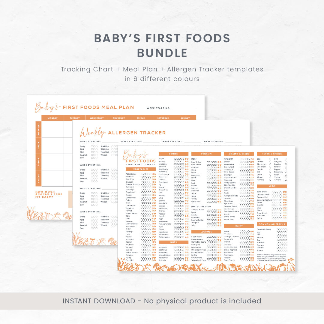 Turn mealtime into a playful adventure with our Baby’s First Foods Bundle! This bundle includes three templates: a food tracking chart, a meal plan template and a weekly allergen tracker. Keep track of your baby’s journey to food, rate their food experiences, and cherish these precious moments as they explore new flavours and textures. Stay organised and create lasting memories with our Baby’s First Foods Bundle!